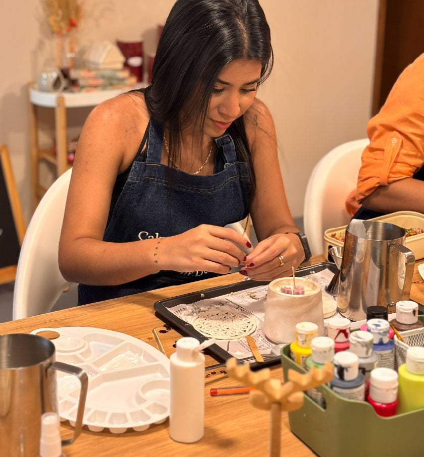En el CandleBar de AMORA eliges tu aroma, mezclas, decoras, pintas, escribes y le das forma a algo que habla de ti. Todo en un ambiente cálido, artístico y profundamente sensorial.